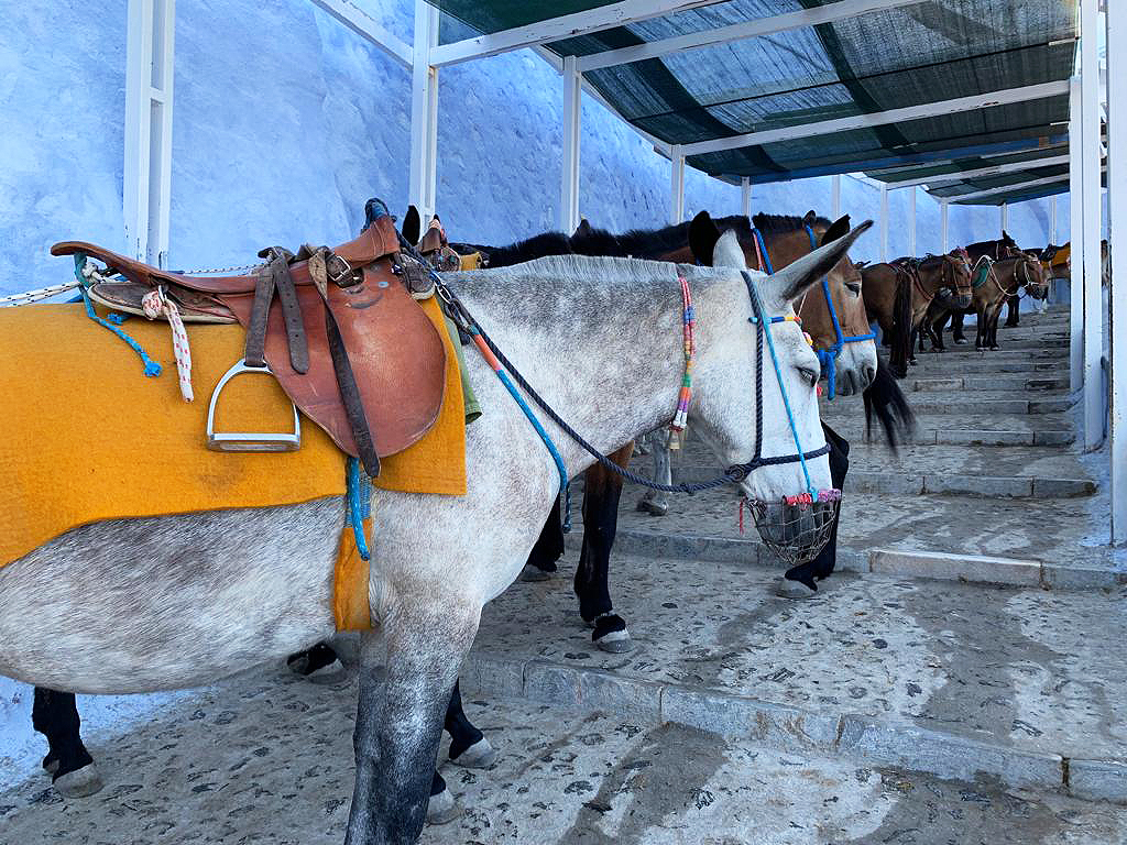 We had decided to take the route down on foot. Many a holidaymaker instead pays just €6 to mount a donkey and let him or her do the hard work for them. No wonder they shat all over the bloody path. As we passed the two dozen or so horses on the steps they stood motionless, almost frozen, with their heads bowed down and their eyes fixed on the cobbles. They were not tied or restrained in any way physically, but adorned with brightly coloured beads and ropes to appear more cheerful to weary passers by. I stopped to take a photograph of them, feeling more like a National Geographic reporter documenting animal cruelty than an avid holidaymaker, and feeling guilty while positioning the lens in case doing so was in some way aiding and abetting the practice. I took the picture even though. At the time, and when I look back, the animals reminded me of the battered wives I had learnt about in A Level psychology: their coping mechanism to deal with the suffering to simply stand and bear it. But I digress.